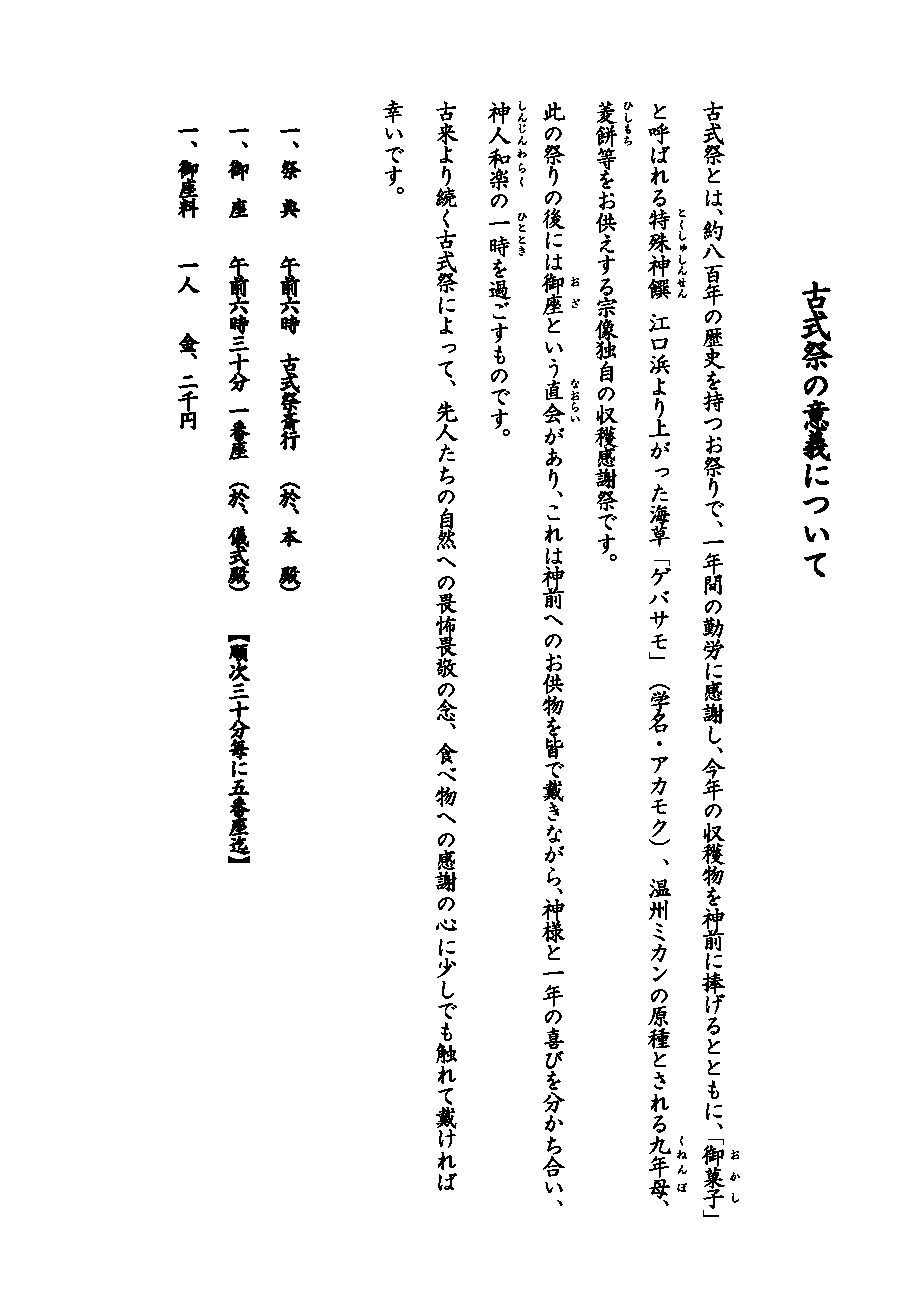 | 10/2 | 11:00 | 例祭 (辺津宮本殿) 主基地方風俗舞奉奏 ※流鏑馬及び翁舞奉納は中止 |
