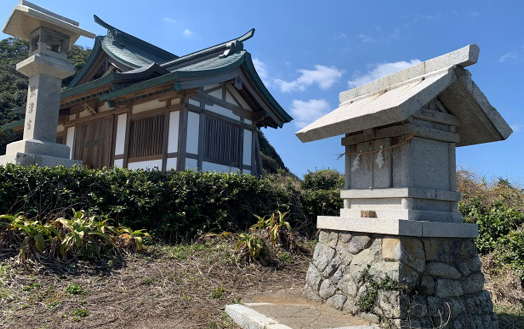 大島の北側にあり、沖津宮の鎮座する沖ノ島を遥拝する拝殿として、昭和8年に再建されたものです。天気のいい日には、沖ノ島を見ることができます。