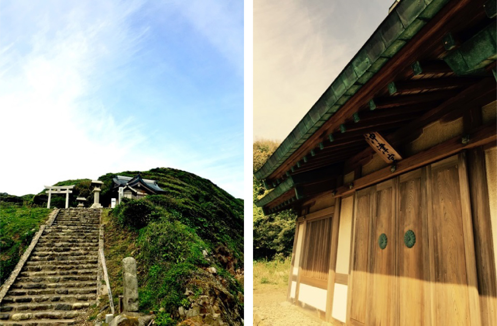 大島の最も高い場所に位置し、神社の裏手では国家祭祀の跡が発見されています。日本神話によれば、ここが湍津姫神の降臨の地と考えられています。
