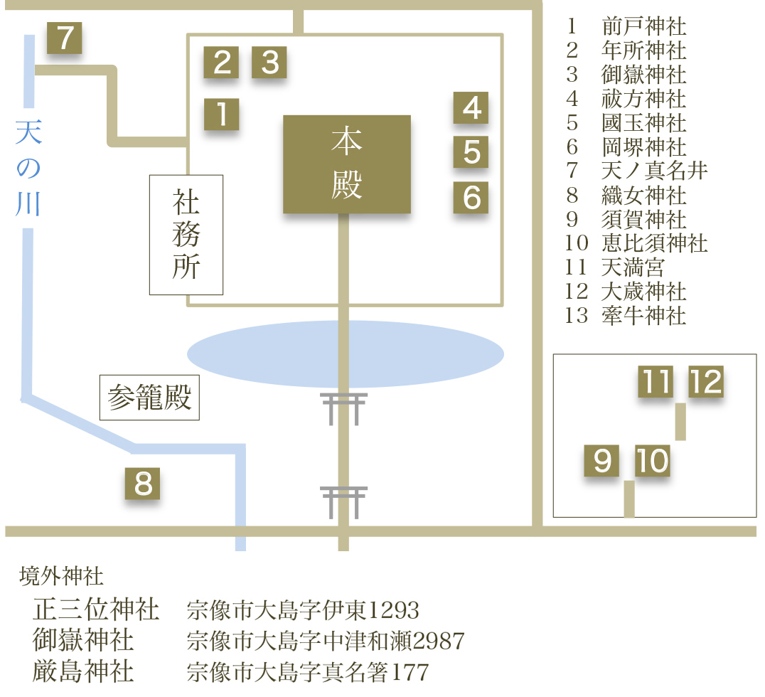 | 3. | 御嶽神社 みたけじんじゃ 御嶽大神、息送大神、息正三位大神、和加大神、九日大神、濱宮大神、御衣代大神、河上大神、龍王大神、五位大神、所主大神 |
