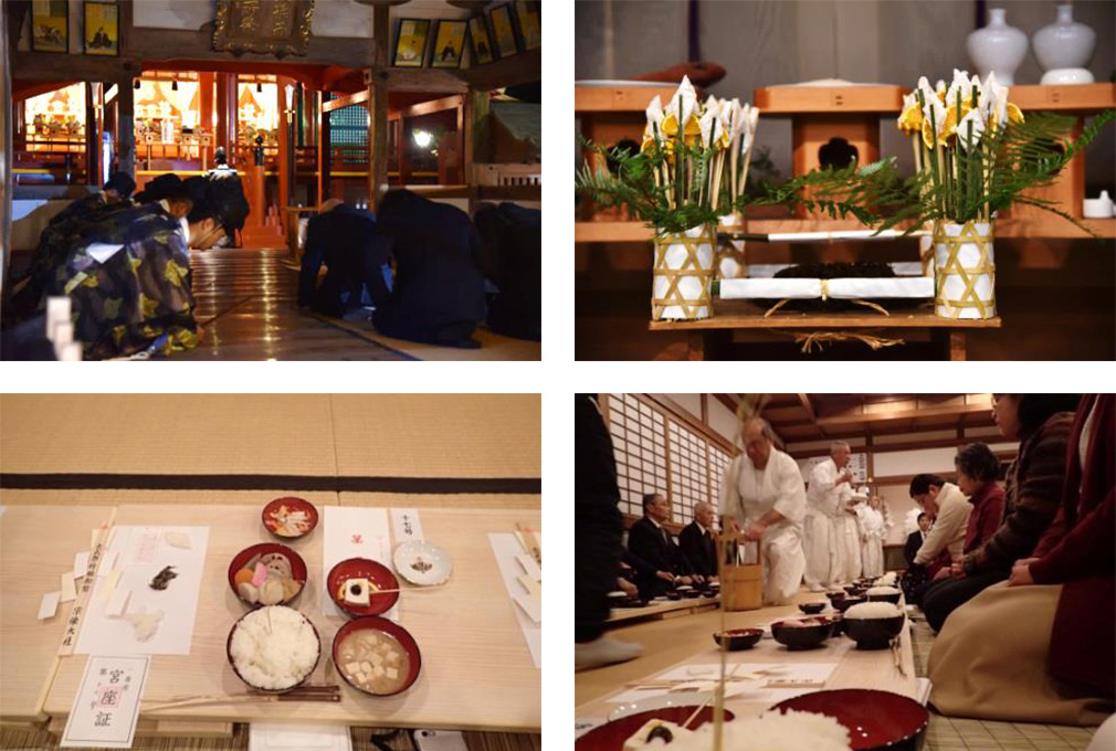 特殊な神饌(九年母・ゲバサ藻・菱餅)を神前にお供えする祭りで、800年以上続いています。祭典後は、6時30分からお供え物を戴く御座があり、初穂料1名2,000円でどなたでもご参加できます。御座券は当日午前5時30分から配布されます。